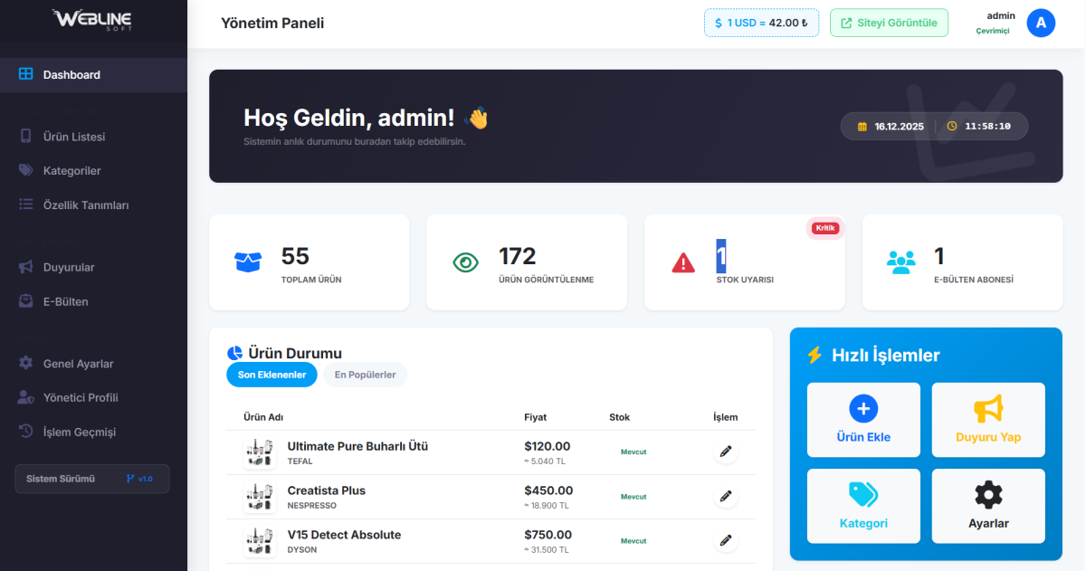 • Log (Kayıt) Sistemi: Admin panelinde kimin ne zaman ne işlem yaptığını (IP adresi ile) kayıt altına alır. Güvenlik için kritiktir.